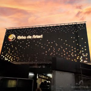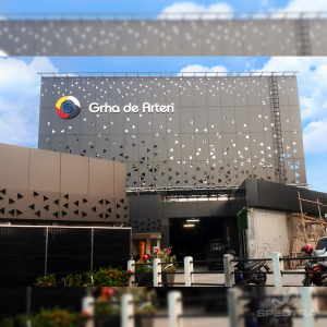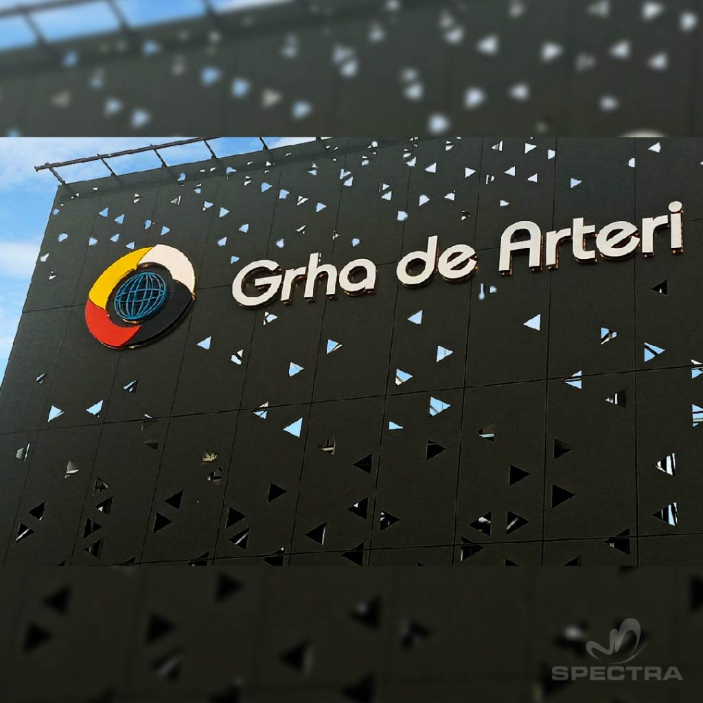 Pekerjaan branding Grha De Arteri, Semarang untuk 2 unit pekerjaan yaitu pembuatan Huruf Timbul dan pembuatan Ornament Cutting Panel pada bagian fasad depan Grha De Arteri. Untuk pekerjaan pembuatan Huruf Timbul pada bagian logo utama brand menggunakan material Galvanis sedangkan untuk bagian nama brand menggunakan material Stainless dengan sistem nyala lampu pendar belakang sehingga lebih menarik perhatian terutama ketika malam hari. Selain itu, pada bagian fasad depan bangunan juga didesain dengan model ornament cutting menggunakan material ACP yang dimana tampilan eksterior dari Grha De Arteri, Semarang jadi terlihat lebih modern, elegan dan eksklusif.