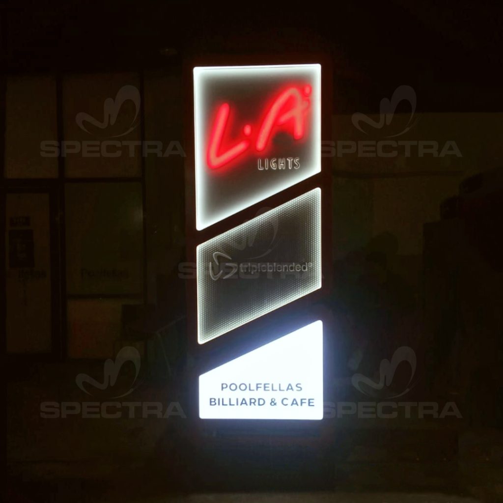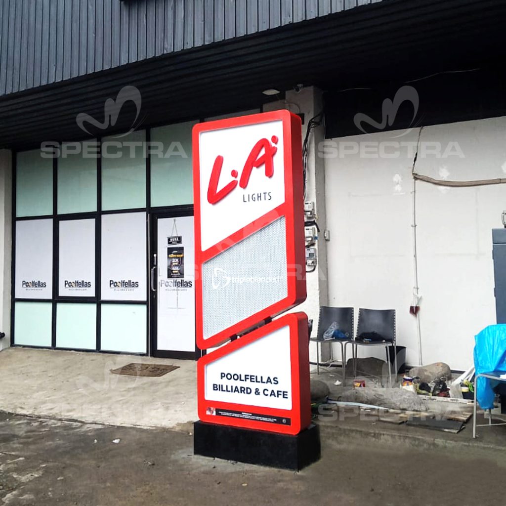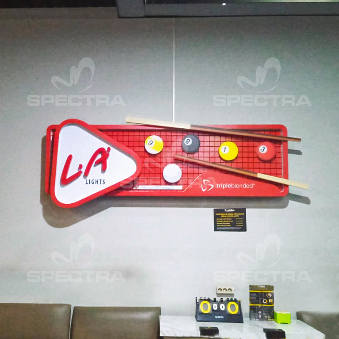 Berkunjung ke kota Pati dan main ke salah satu kafe & arena billiard yang cukup terkenal di sana tim spectra_adv telah menyelesaikan project branding LA Lights di salah satu kafe dan arena billiard yang ada di Pati yaitu Poolfellas Billiard & Cafe. Ada beberapa materi yang dikerjakan dalam project branding ini, yaitu 1 unit Totem, dan 2 Wallsign Indoor.