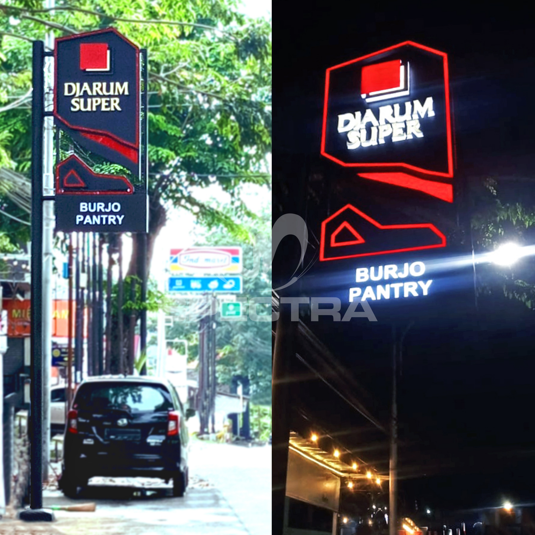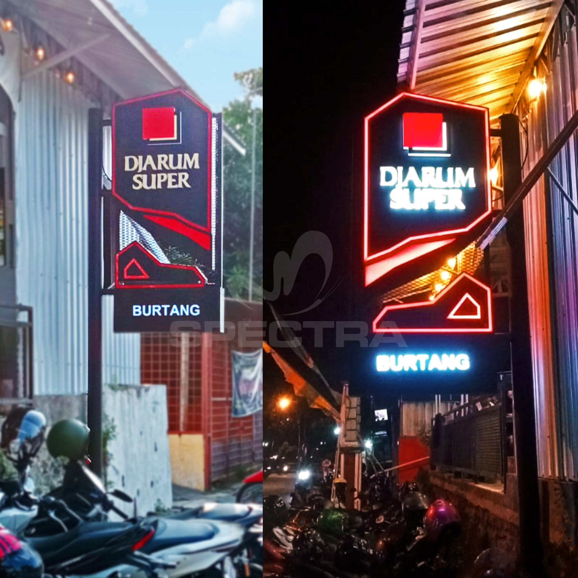 Project pembuatan pylon custom untuk branding brand Djarum Super dengan 2 venue yaitu Burjo Pantry Sriwijaya & Burtang Puspanjolo. Pada era sekarang, media pylon ataupun neon box bisa kita jumpai di berbagai tempat bisnis mulai dari yang besar maupun usaha kecil. Berbagai manfaat dari media pylon selain sebagai sarana promosi juga dapat meningkatkan identitas sebuah brand, serta dapat mempercantik tampilan dari suatu tempat bisnis.